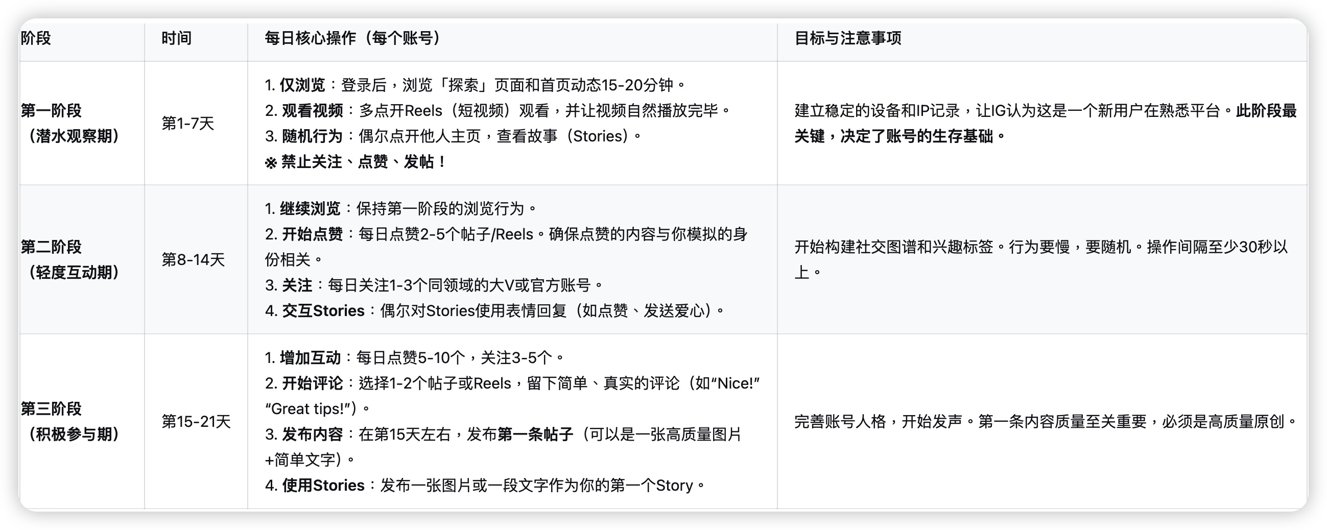 专门针对Instagram工作室的批量养号,这是一个需要高度精细化和系统化操作的任务。虽然原理与Twitter类似,但Instagram的算法和风控侧重点有所不同。 以下是一套实战性极强的Instagram工作室养号经验,分为 「核心原则」、「硬环境搭建」、「养号执行流程」、「内容与互动策略」和「风险管控」 五大板块。...
